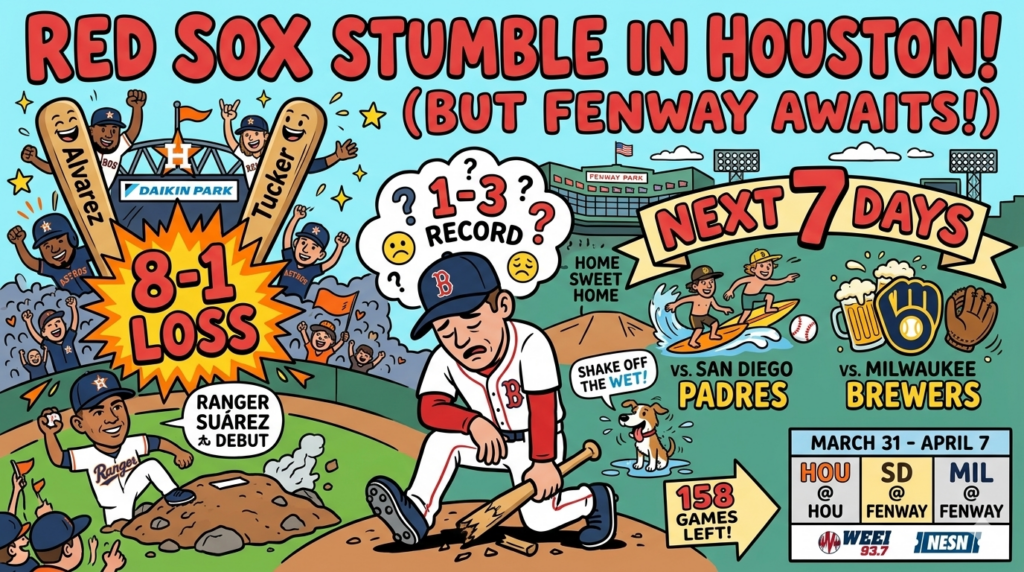 The Boston Red Sox began their three-game series in Houston on March 30, 2026, with the kind of performance that makes you wonder if the baseball gods were testing their patience—or simply having a little fun at their expense. In an 8-1 loss to the Astros at Daikin Park, the Sox saw their season record slide to 1-3. Newcomer Ranger Suárez took the mound for his debut, but Houston’s bats were apparently preheating for summer fireworks, pounding the ball with authority and leaving the Fenway Faithful at home reaching for comfort snacks and remote controls. Meanwhile, the Astros improved to 3-2, clearly thrilled to be the early-season example of what ‘winning baseball’ looks like.